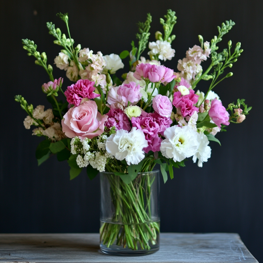 Un elegante y sofisticado arreglo floral, cuidadosamente diseñado para destacar en cualquier espacio. Este arreglo incluye una selección de flores frescas, dispuestas armoniosamente en un florero de vidrio, creando una pieza única que resalta por su belleza y frescura.