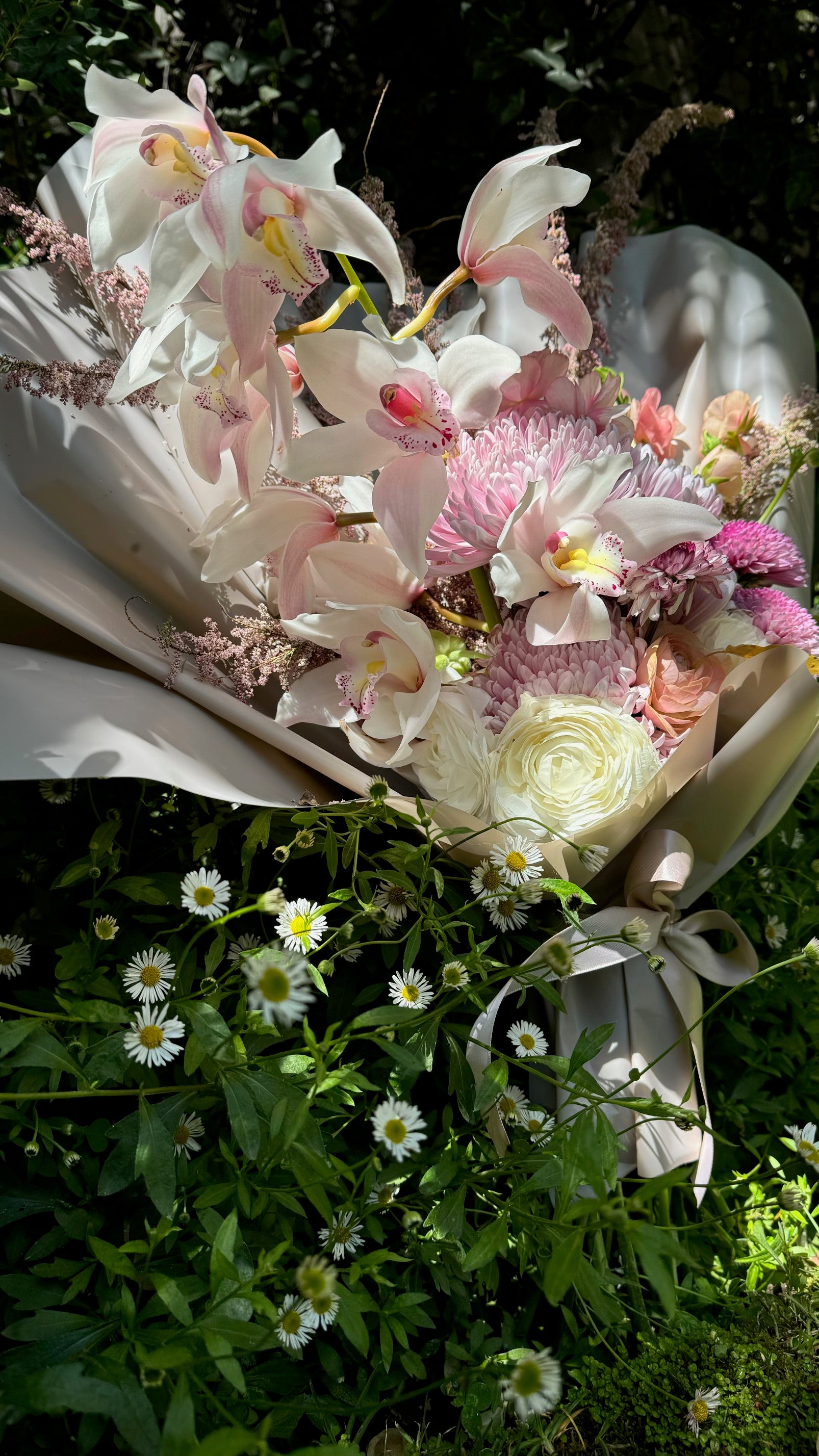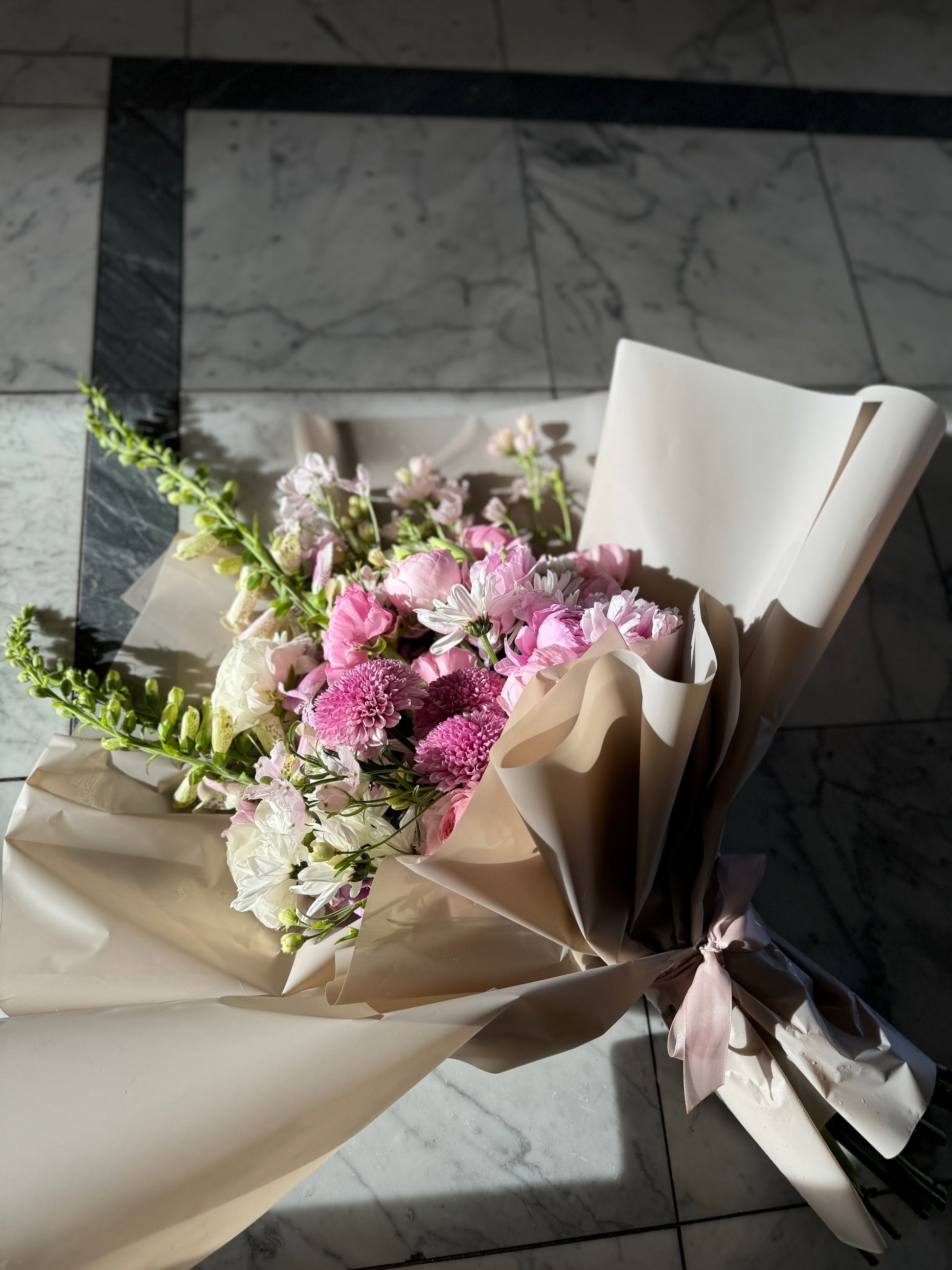 Ramo frontal, de flores frescas con envoltorio tipo ostra.
